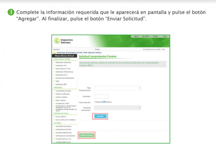 Para solicitar las secuencias de NCF, el contribuyente debe acceder a la Oficina Virtual y seguir el siguiente proceso: